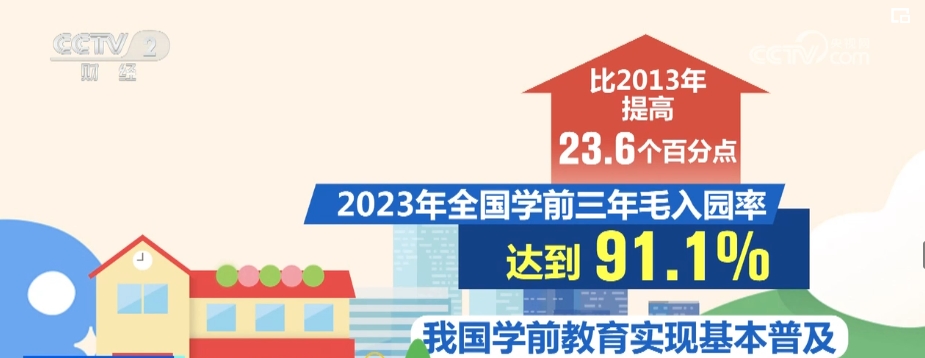 據(jù)介紹,截至2023年,全國幼兒園數(shù)量達到27.4萬所,2023年全國學前三年毛入園率達到91.1%,比2013年提高了23.6個百分點,我國學前教育實現(xiàn)基本普及。