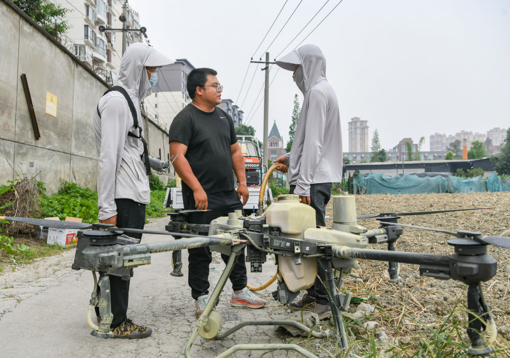 在四川成都溫江區(qū)萬春鎮(zhèn),舒星宇(中)和植保無人機(jī)飛手在溝通當(dāng)天打藥的區(qū)域和作業(yè)時(shí)間(5月16日攝)。