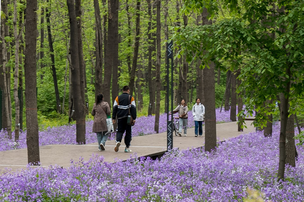 市民、學(xué)生在東北林業(yè)大學(xué)城市林業(yè)示范基地內(nèi)散步(5月11日攝)。(李俊達(dá) 攝)