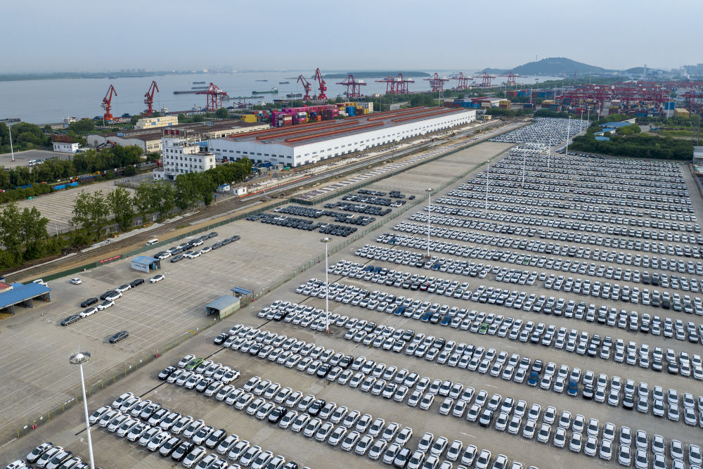 5月26日,在安徽蕪湖港朱家橋港區(qū)國際集裝箱碼頭,整齊排列的汽車等待出口(無人機照片)。 新華社發(fā)(肖本祥 攝)