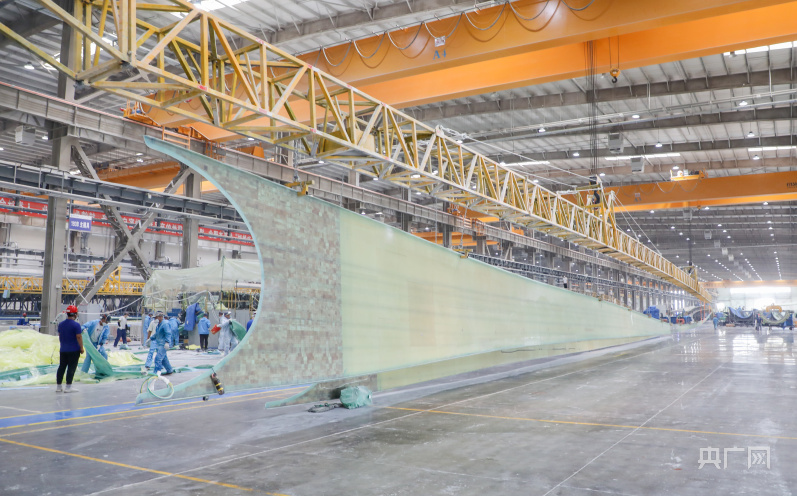 6條百米級及以上葉片生產(chǎn)線上,一個(gè)超百米長的“裸裝“風(fēng)力發(fā)電葉片放置車間中央,靜待技術(shù)人員“美顏”包裝。自主研制的陸上超大型玻纖葉片便是從這里運(yùn)往沙漠、戈壁、荒漠地區(qū)。