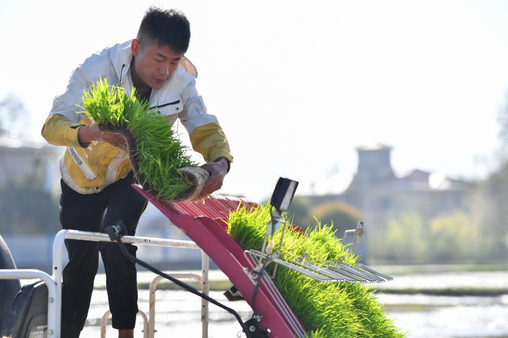 2024年3月29日,在湖南省長沙市望城區(qū)高塘嶺街道沱市村,農(nóng)戶將秧苗放到插秧機(jī)上。新華社記者 陳澤國 攝