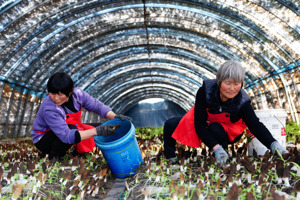 2024年3月20日,農(nóng)民在山東省濟(jì)寧市微山縣驩城鎮(zhèn)袁堂華能光伏電站農(nóng)光互補(bǔ)項(xiàng)目的大棚里采摘羊肚菌。該項(xiàng)目是采煤塌陷區(qū)綜合整治項(xiàng)目,集農(nóng)光互補(bǔ)、漁光互補(bǔ)于一體。新華社記者 郭緒雷 攝