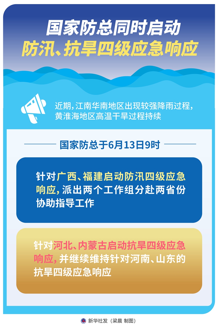 近期,江南華南地區(qū)出現較強降雨過程,黃淮海地區(qū)高溫干旱過程持續(xù)。國家防總于6月13日9時針對廣西、福建啟動防汛四級應急響應,派出兩個工作組分赴兩省份協(xié)助指導工作;針對河北、內蒙古啟動抗旱四級應急響應,并繼續(xù)維持針對河南、山東的抗旱四級應急響應。