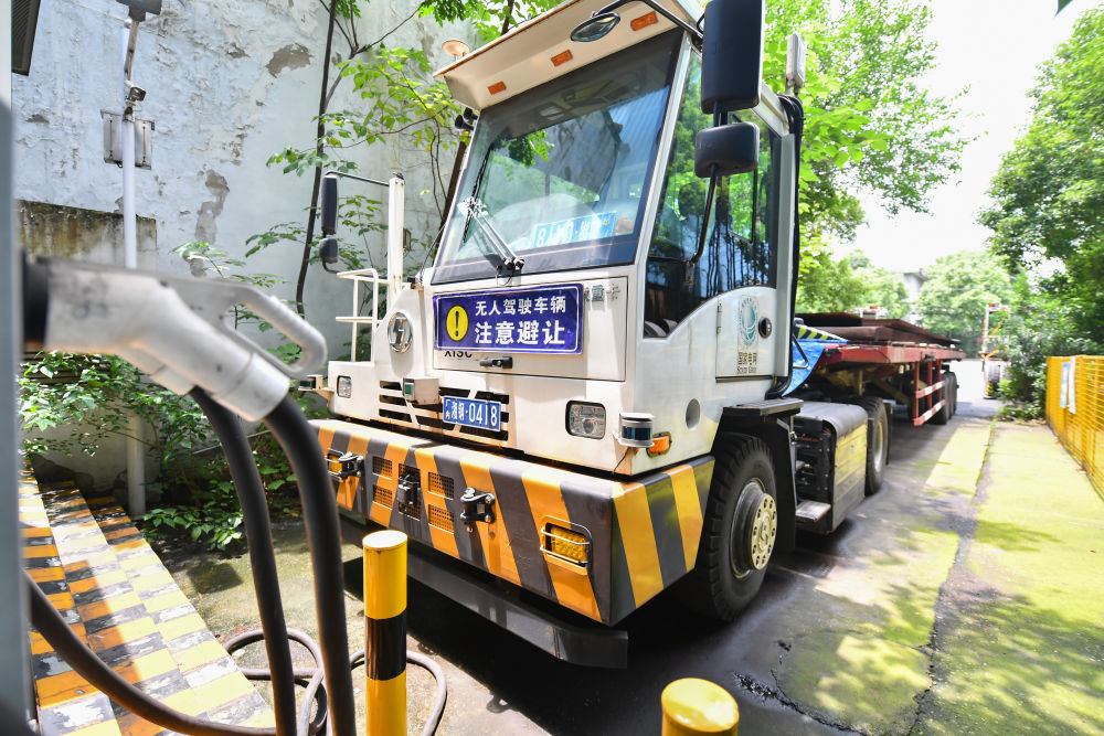 2024年6月13日,在湖南省湘潭市,一臺碼頭無人牽引車??吭谙嫣朵撹F集團(tuán)有限公司的充電站。碼頭無人牽引車?yán)?G通信和北斗定位技術(shù),結(jié)合激光雷達(dá)和相機(jī)等傳感器對周圍的環(huán)境進(jìn)行動態(tài)的高精度建模,實時獲取牽引車與掛車的相對位置信息和環(huán)境信息。 新華社記者 陳澤國 攝