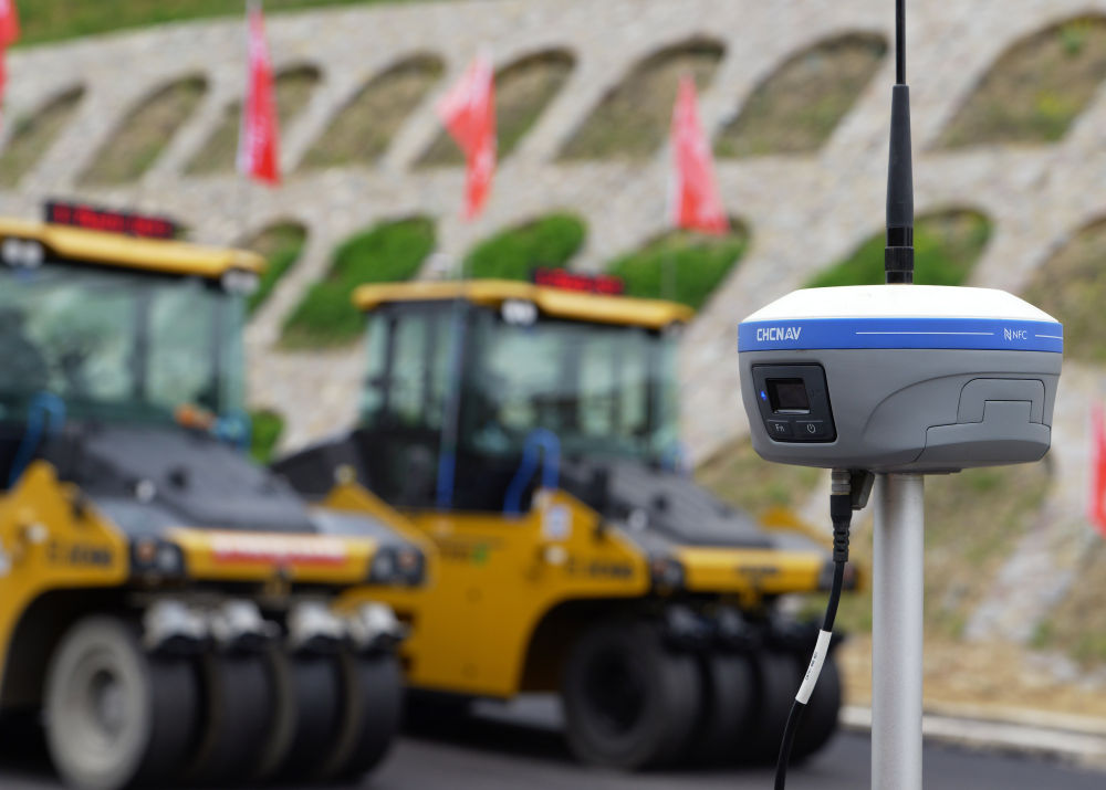 2024年4月11日,在河南新縣境內(nèi)的沿大別山高速公路雞公山至商城段,基準(zhǔn)站在為作業(yè)中的無人駕駛壓路機(jī)提供定位坐標(biāo)。 新華社記者 李嘉南 攝