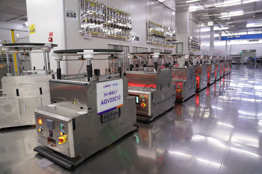2024年6月4日,在位于江西省南昌市高新區(qū)的江西兆馳半導(dǎo)體有限公司外延車間,AGV自動轉(zhuǎn)運小車在5G技術(shù)支持下進(jìn)行自動搬運。 新華社記者 周密 攝