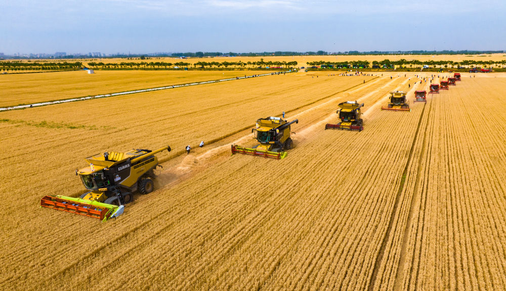 5月29日,在河南省駐馬店市西平縣老王坡高標準農(nóng)田,當?shù)胤N糧大戶聯(lián)合農(nóng)機合作社舉行小麥開鐮收割儀式。這是機收編隊在收獲小麥。新華社發(fā)(趙永濤攝)