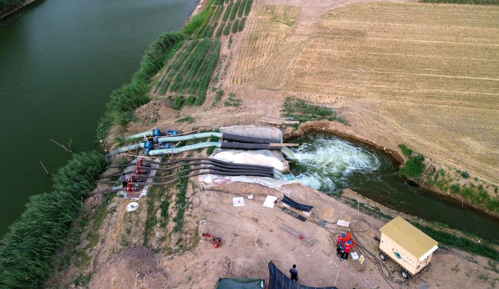 6月18日,在山東省巨野縣麒麟鎮(zhèn)的一處抗旱應(yīng)急取水點(diǎn),水泵正在抽水輸入農(nóng)田灌溉渠道(無人機(jī)照片)。新華社記者 徐速繪 攝