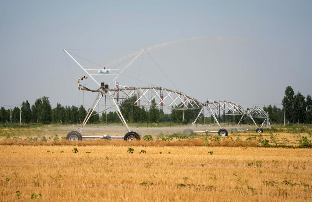 6月19日,在山東省高青縣青城鎮(zhèn),一臺(tái)大型農(nóng)用澆灌設(shè)備用黃河水澆灌農(nóng)田。新華社記者 徐速繪 攝