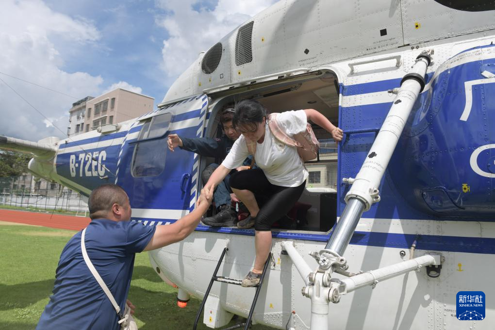 救援直升機(jī)將廣東省梅州市平遠(yuǎn)縣泗水鎮(zhèn)大新村的村民轉(zhuǎn)移到縣城(6月19日攝)。新華社記者 盧漢欣 攝