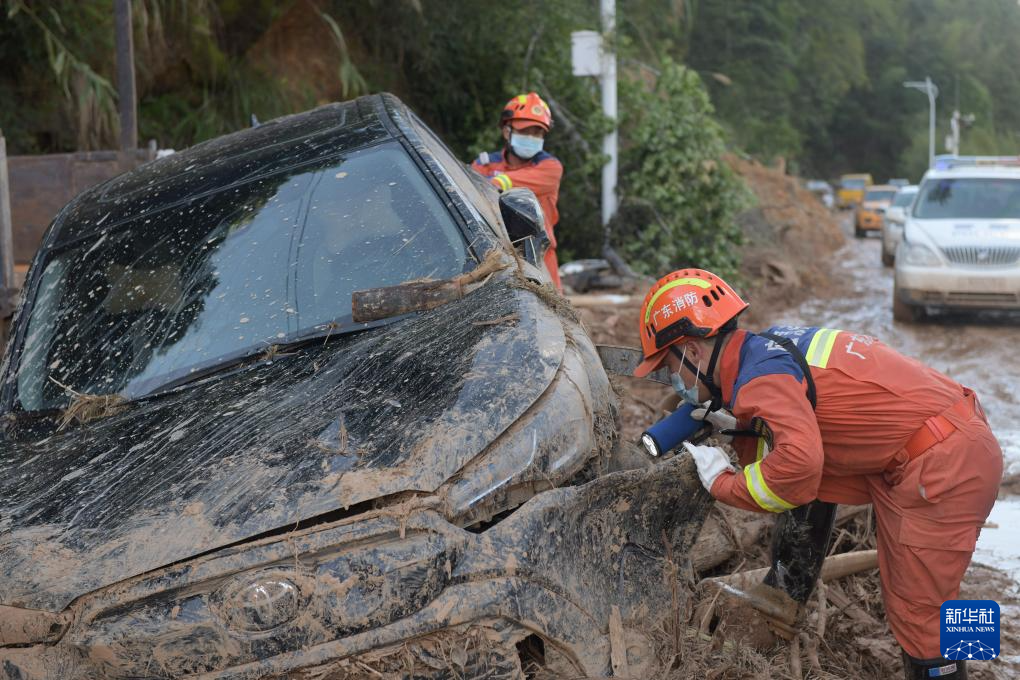 救援人員在廣東省梅州市平遠(yuǎn)縣泗水鎮(zhèn)開展救援工作(6月20日攝)。新華社記者 盧漢欣 攝