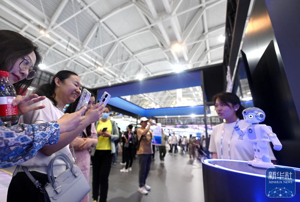 6月21日,參觀者在博覽會上和一款機器人互動。