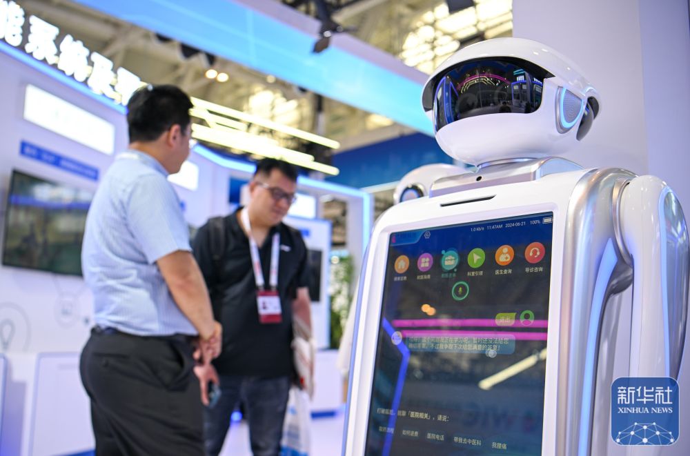 6月21日,與會者在博覽會現場咨詢了解一款適用于醫(yī)療場景的導診機器人。