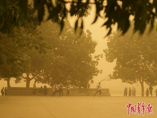 這時候,學(xué)生們?nèi)哉驹诓賵錾险f話,上課鈴響了,才慢慢踱回樓里。學(xué)校外面,路邊的人就坐在沙霧里吃燒烤,出租車大敞著窗戶載客,騎電動車的人偶爾瞇起眼睛,沙子打得臉疼,也絕不戴口罩。之后,人們像掃雪一樣,耐心地掃去門口、窗臺上的沙土。
