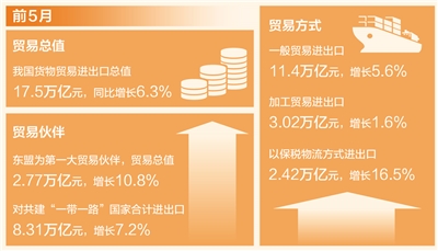 我國外貿(mào)前5月成績單近日出爐,貨物貿(mào)易進出口總值同比增長6.3%。其中,出口增長6.1%,進口增長6.4%。5月當(dāng)月,進出口同比增長8.6%,出口增長11.2%,進口增長5.2%。