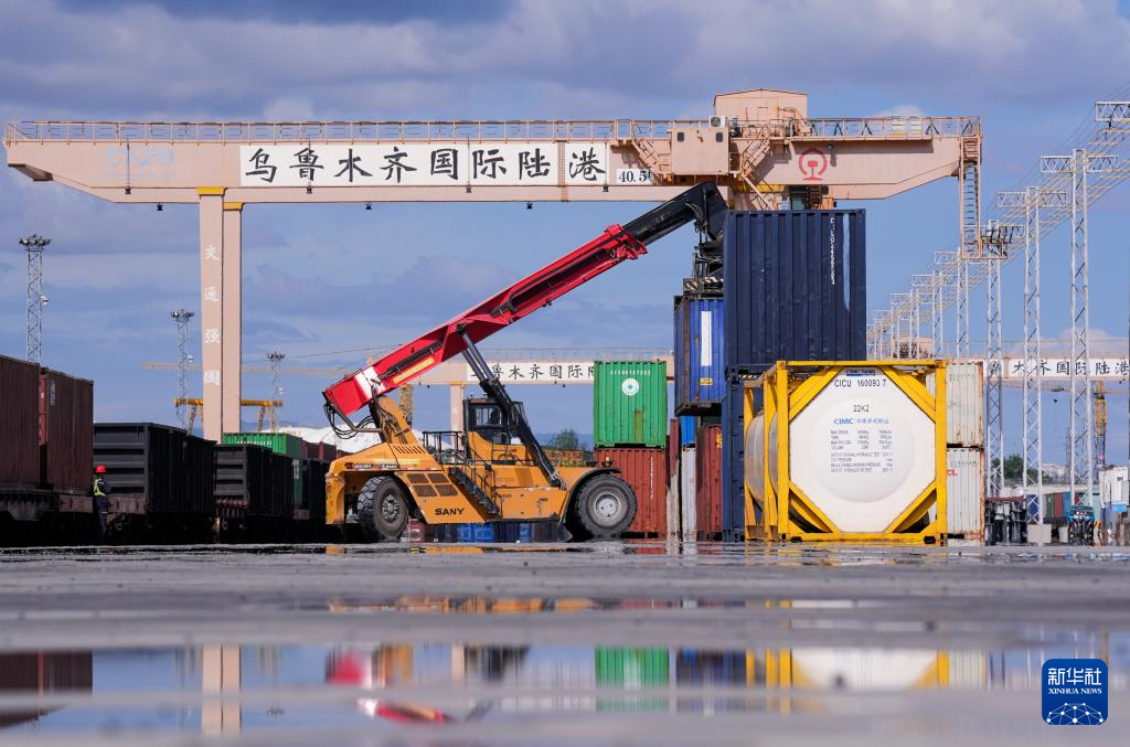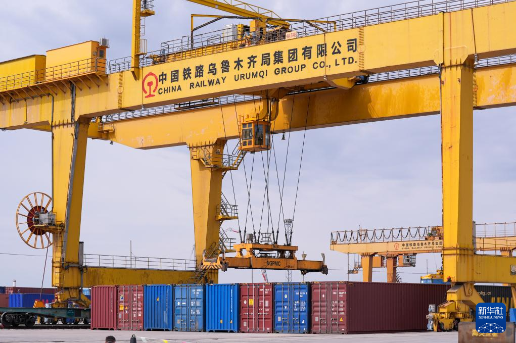 在新疆烏魯木齊國際陸港區(qū),集裝箱裝卸作業(yè)有序進(jìn)行(2024年5月27日攝)。新華社記者 王菲 攝