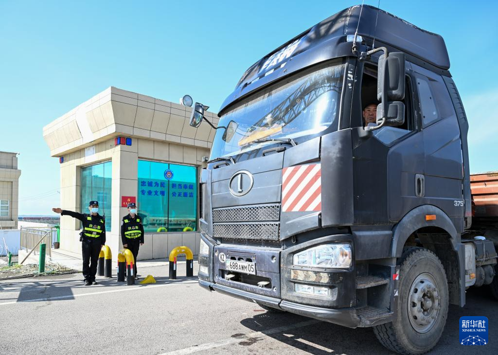 2024年4月18日12時(shí)許,在霍爾果斯公路口岸,一輛來自哈薩克斯坦的貨車通過查驗(yàn)站。新華社記者 陳朔 攝