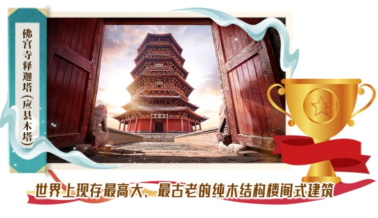 應縣木塔建于遼清寧二年(公元1056年),與意大利比薩斜塔、法國巴黎埃菲爾鐵塔并稱“世界三大奇塔”。采用純木結(jié)構(gòu)搭建,全塔無釘無鉚。全塔使用的斗拱形式達50余種,有“斗拱博物館”之稱。