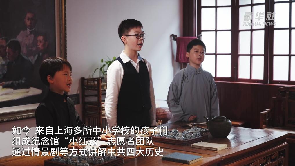 紀(jì)念館場景再現(xiàn)廳還原了當(dāng)年廣吉里的會議場景:一塊寫著英文的黑板,長條桌邊圍著一圈木凳。如今,這個場景成為“紅色課堂”,來自上海多所中小學(xué)校的孩子們組成紀(jì)念館“小紅花”志愿者團(tuán)隊,通過情景劇等方式,講解中共四大歷史。