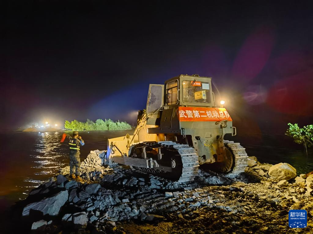 已是7日凌晨三點,武警第二機動總隊二級上士李貴權(quán)左手揮著紅色指揮旗,右手握著手電,指揮推土機把一塊塊大石料推進決口處。