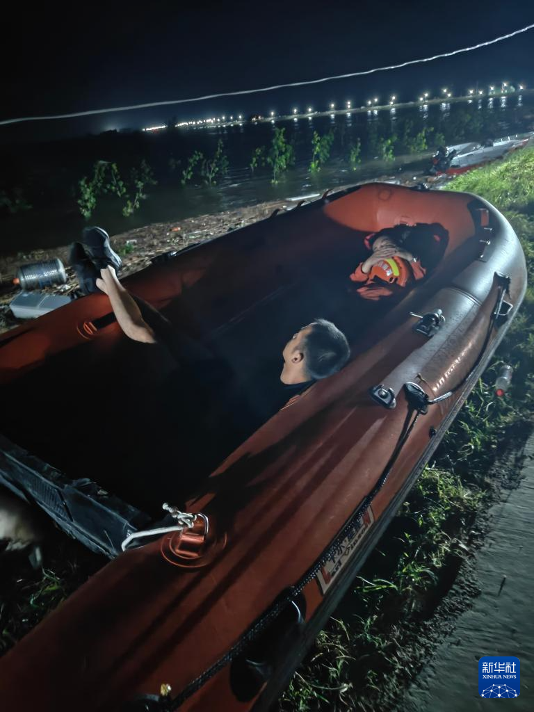 7月7日凌晨,在湖南省岳陽市華容縣團洲垸洞庭湖一線堤防決口處,隨時待命的搶險救援人員在橡皮艇里小憩。新華社記者 黎云 攝