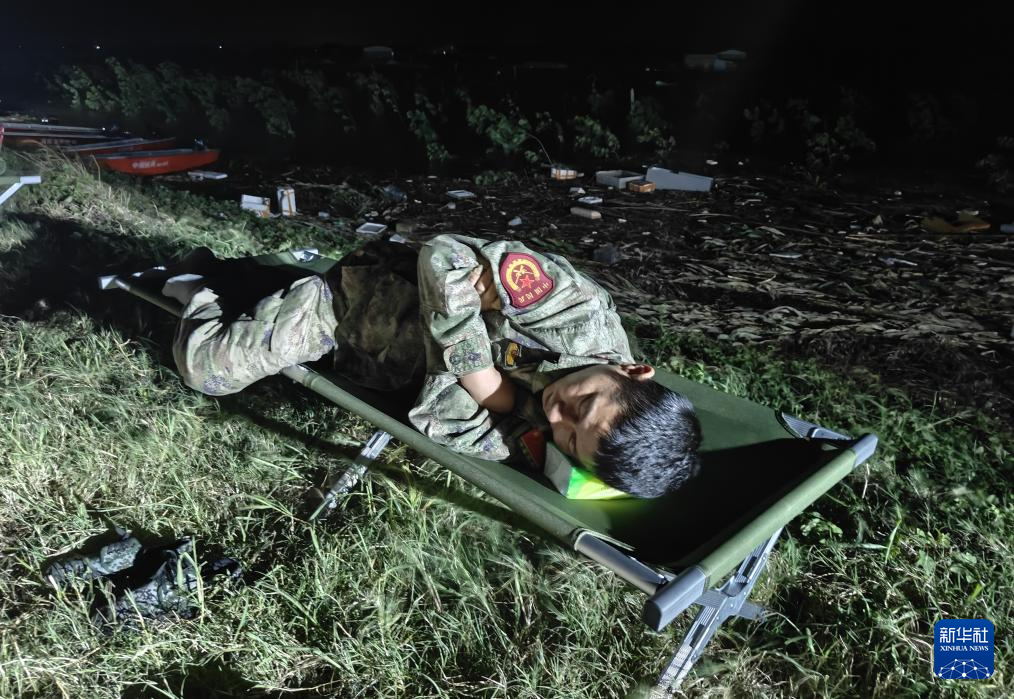 7月7日凌晨,在湖南省岳陽市華容縣團洲垸洞庭湖一線堤防決口處,隨時待命的民兵突擊隊員合衣小憩。新華社記者 黎云 攝