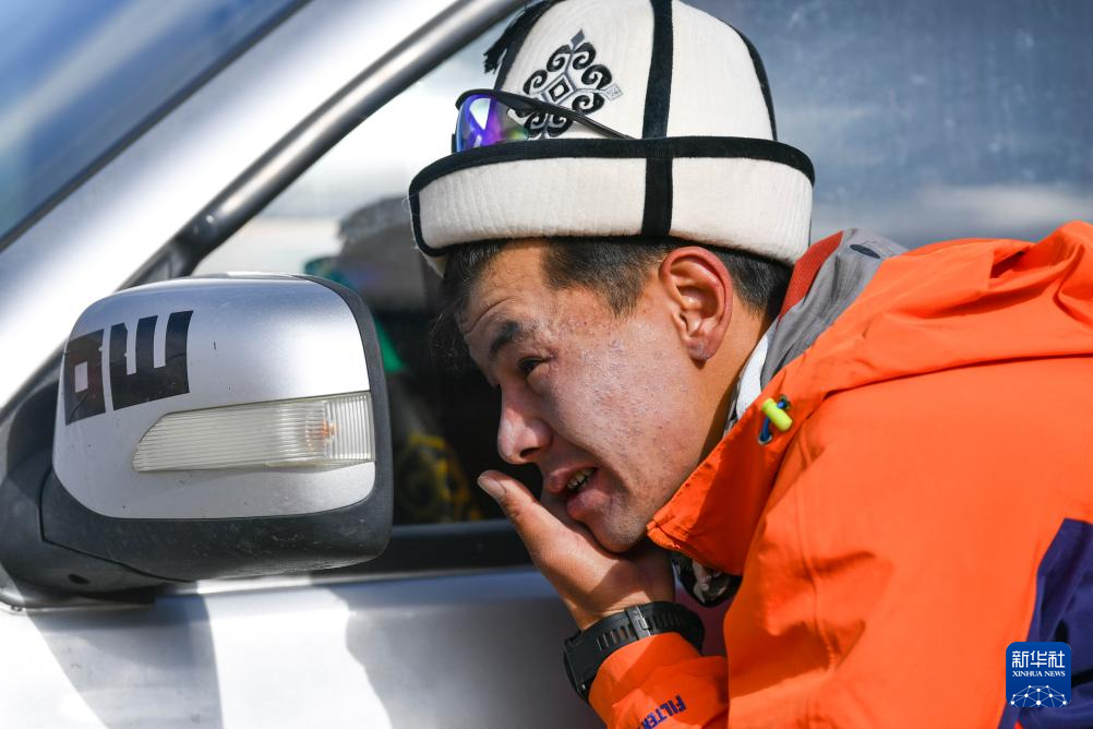 7月4日,登山隊(duì)伍即將出發(fā)上山,塔西巴伊對(duì)著汽車(chē)后視鏡涂抹防曬霜。新華社記者 胡虎虎 攝