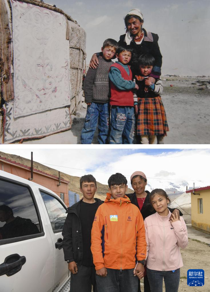 拼版照片:上圖為國(guó)外登山隊(duì)于2007年8月22日為塔西巴伊(前中)、哥哥(前左)、妹妹(前右)、母親在慕士塔格峰下牧場(chǎng)氈房旁拍攝的合影(7月5日翻拍資料照片);下圖為2024年7月5日塔西巴伊(前中)、哥哥(前左)、妹妹(前右)、母親在慕士塔格峰下新居前拍攝的合影(新華社記者胡虎虎攝)。新華社發(fā)