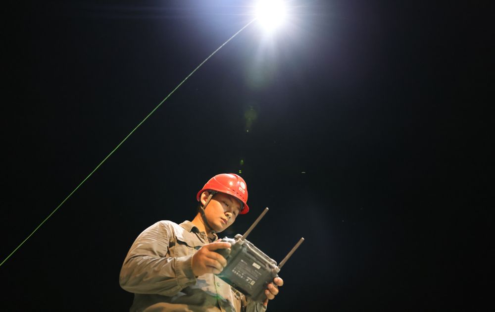 在堵口作業(yè)現(xiàn)場,劉子翔負責操作系留式無人機,為施工人員提供夜間照明。他時刻注意風向、風速,根據(jù)施工人員的需求,及時調(diào)整無人機的位置,確?!罢盏靡?、照得亮”。