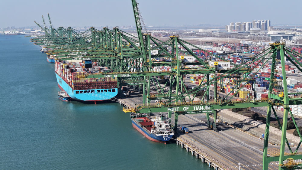 圖為2月3日拍攝的天津港集裝箱碼頭(無(wú)人機(jī)照片)。新華社記者 趙子碩 攝