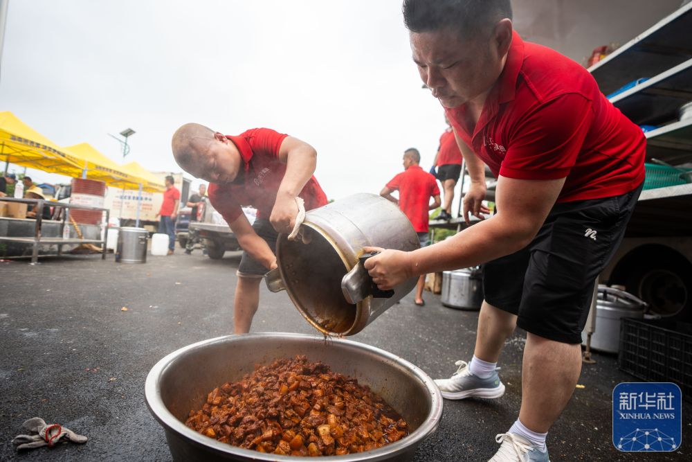 7月10日,在岳陽市良心堡鎮(zhèn)望君洲村,志愿者在炒菜。新華社記者 陳澤國(guó) 攝