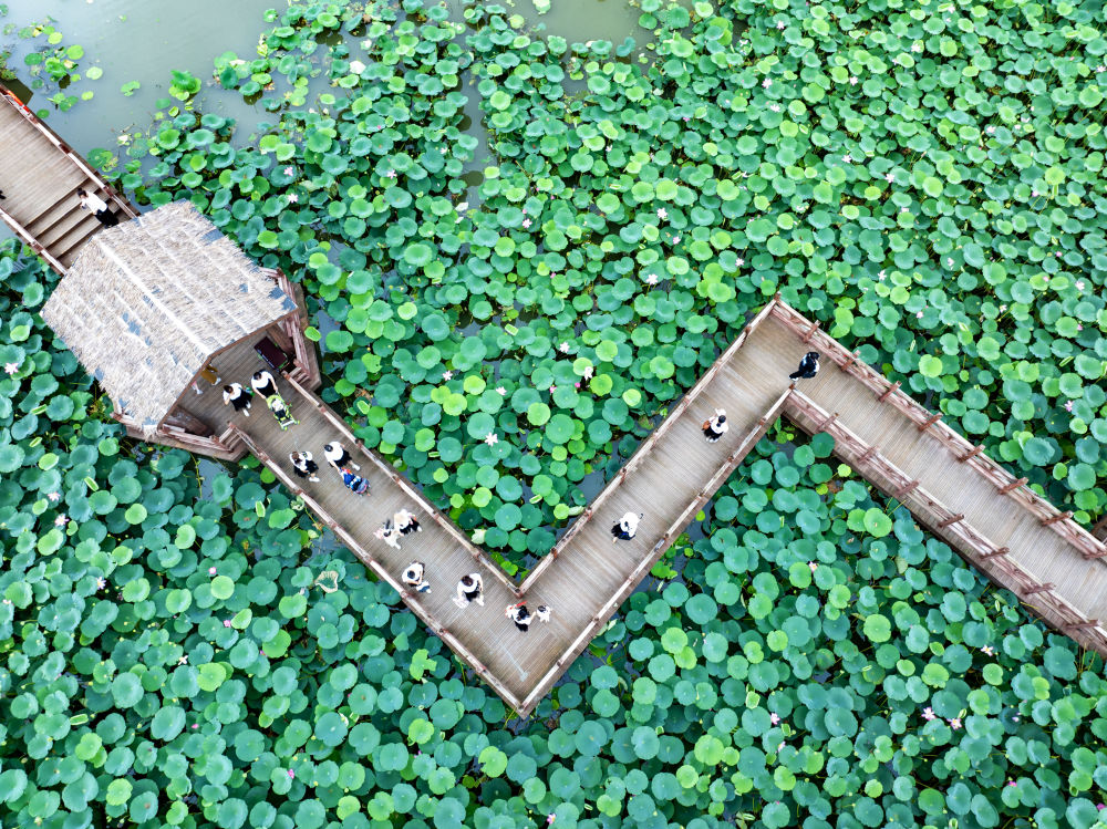 7月14日,游人在江蘇興化里下河國(guó)家濕地公園游玩(無(wú)人機(jī)照片)。新華社發(fā)(周社根攝)