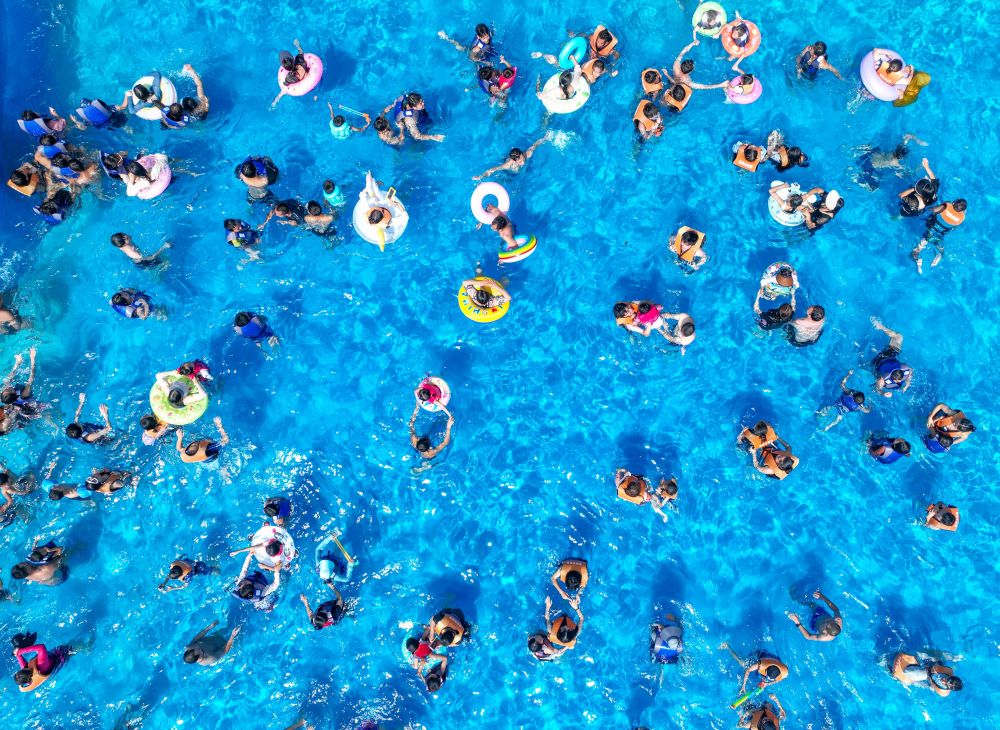 7月14日,人們?cè)谥貞c市酉陽(yáng)土家族苗族自治縣一水上樂(lè)園游玩戲水(無(wú)人機(jī)照片)。新華社發(fā)(邱洪斌攝)