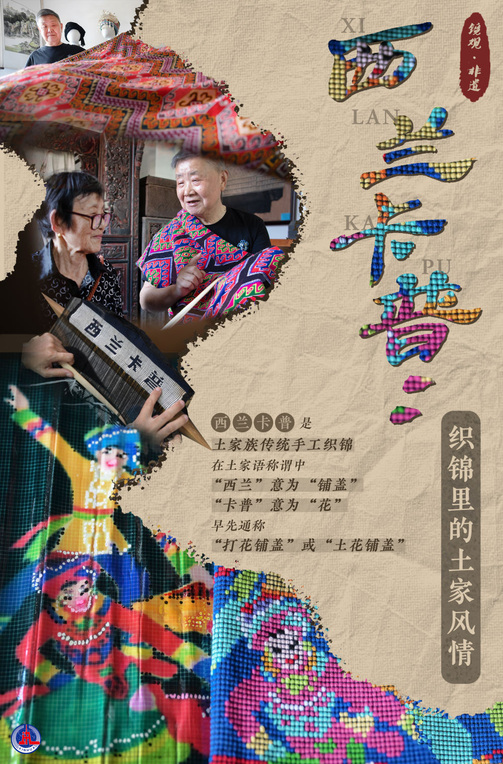 西蘭卡普是土家族傳統(tǒng)手工織錦,在土家語稱謂中,“西蘭”意為鋪蓋,“卡普”意為花,早先通稱“打花鋪蓋”或“土花鋪蓋”。土家孩子出生時(shí)外婆要送織錦,嬰幼兒時(shí)要蓋織錦,女孩子自小學(xué)習(xí)織錦,出嫁時(shí)在織機(jī)上制作西蘭卡普作為陪嫁。西蘭卡普記錄了土家族的風(fēng)俗和情感,與土家人的生活息息相關(guān),被譽(yù)為土家族的“五彩活化石”,2006年被列入國(guó)家級(jí)非物質(zhì)文化遺產(chǎn)名錄。