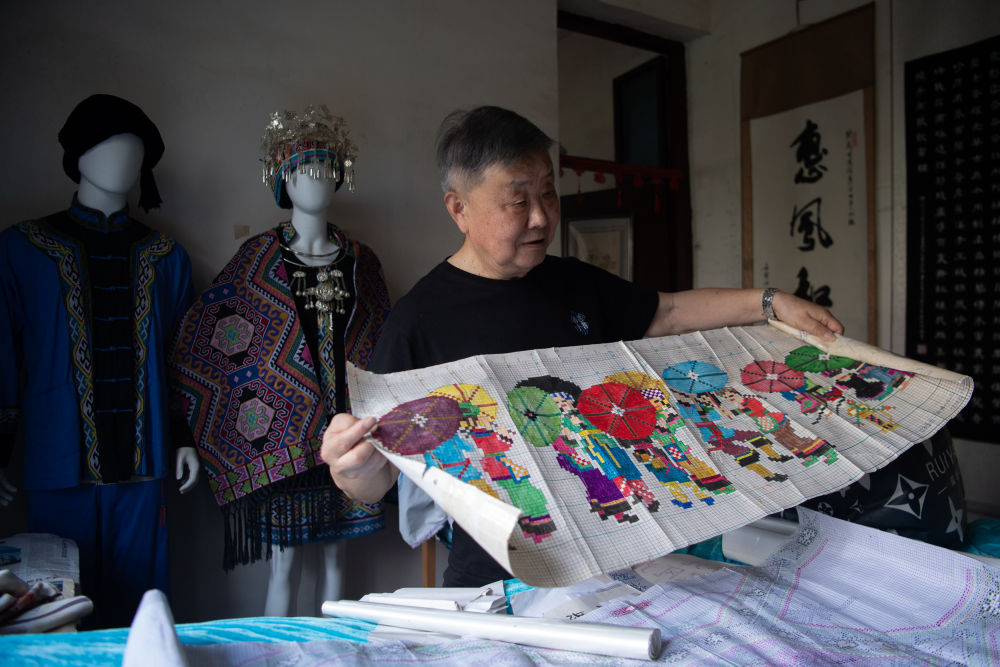 7月2日,湖北省來鳳縣桂花樹社區(qū),唐洪祥在家中展示西蘭卡普?qǐng)D紙。
