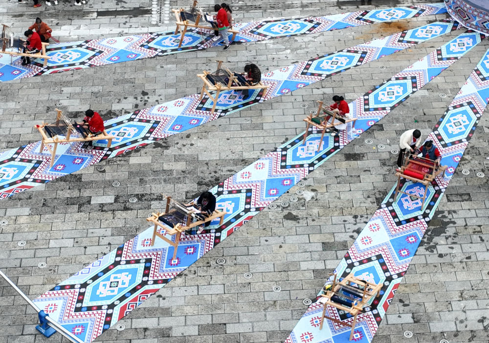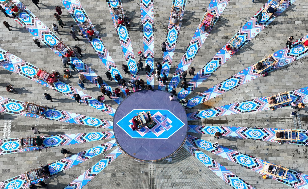 織錦女工在來鳳縣龍鳳文化中心廣場(chǎng)現(xiàn)場(chǎng)制作西蘭卡普,展示非遺技藝(2023年10月28日攝,無人機(jī)照片)。