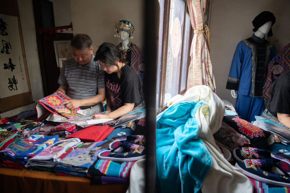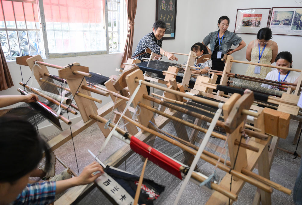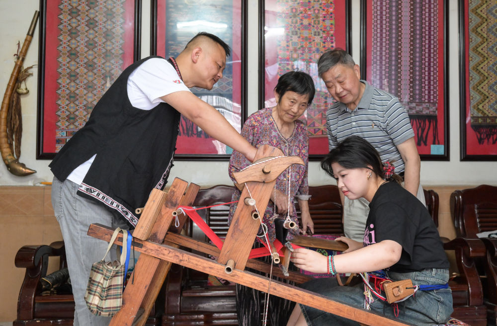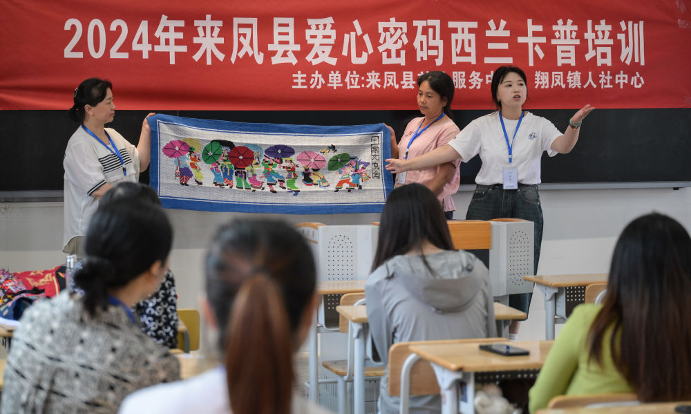 7月2日,唐洪祥的孫女唐鳴珂(后右一)在來鳳縣西蘭卡普培訓(xùn)班上展示西蘭卡普成品。今年29歲的唐鳴珂國(guó)外留學(xué)后回到家鄉(xiāng),從事西蘭卡普的傳承發(fā)展工作。