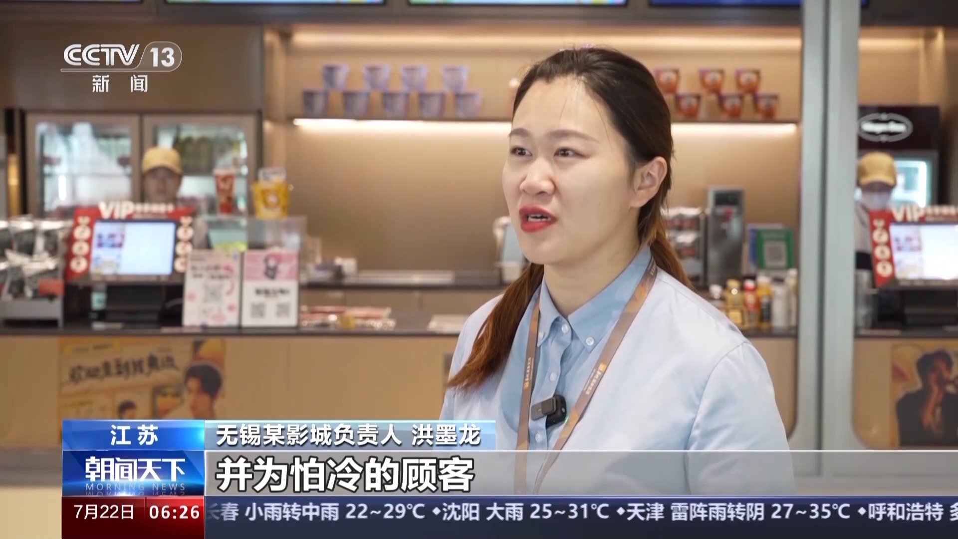無錫某影城負(fù)責(zé)人 洪墨龍:首先我們保證影廳的溫度適宜,并為怕冷的顧客提供免費(fèi)干凈的毛毯。我們還會通過現(xiàn)場的陳列布置,打造主題觀影氛圍,讓觀眾在觀影過程中有更多的參與感和互動體驗。