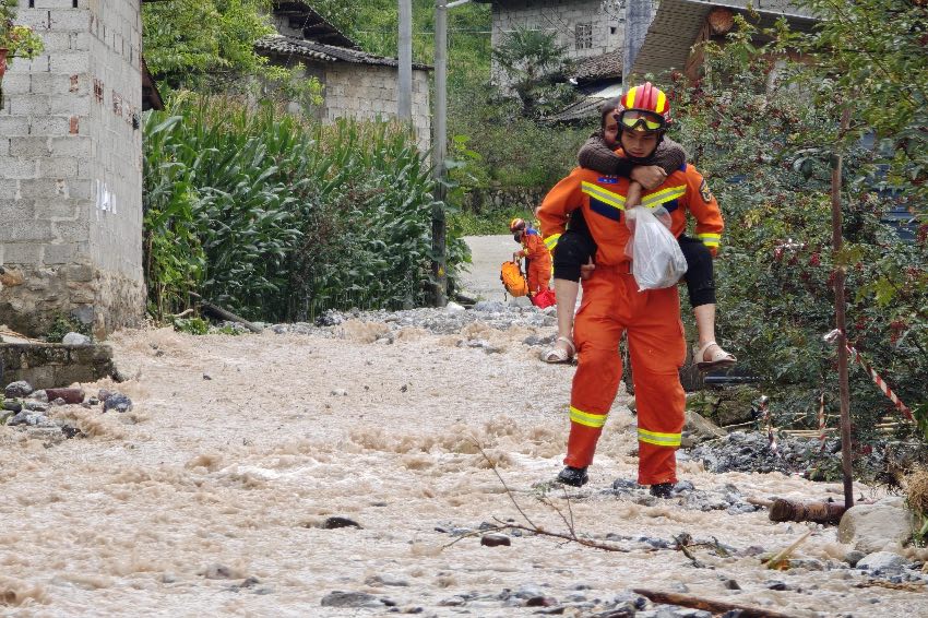山洪過后,到處都是石頭、泥灘,救援隊伍只能走河床、山地、玉米地,還要穿過花椒林;當(dāng)不能兩人并排抬時,就一個人往前一點點送。