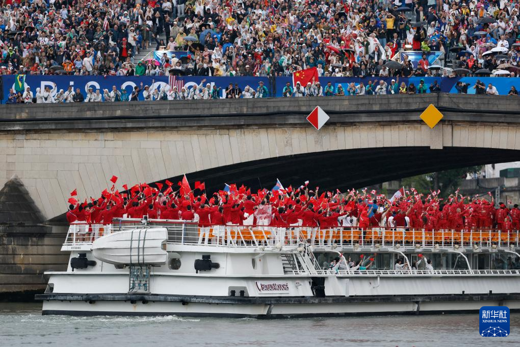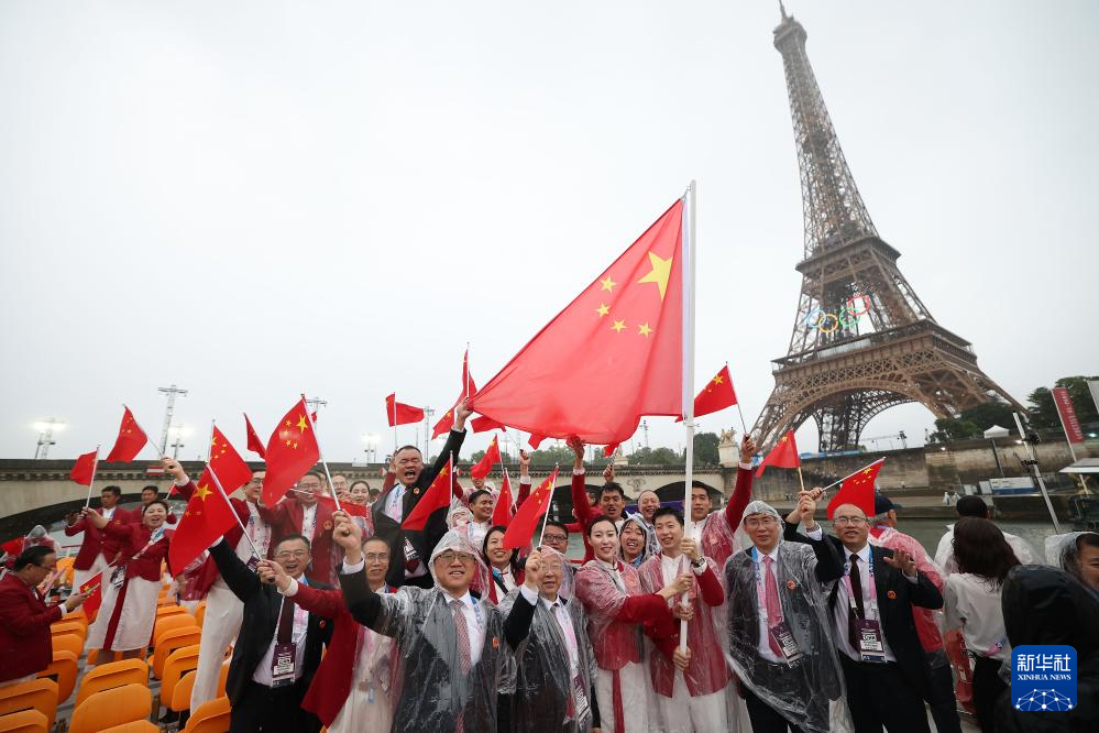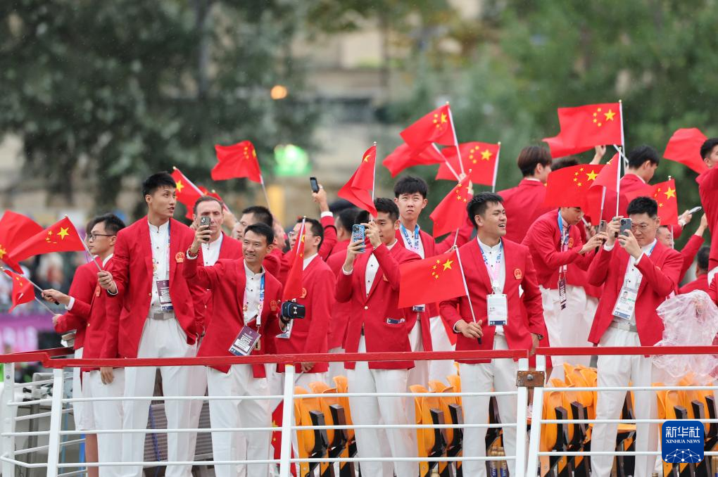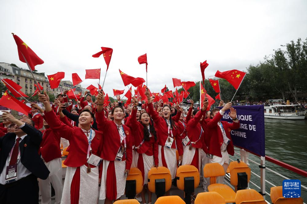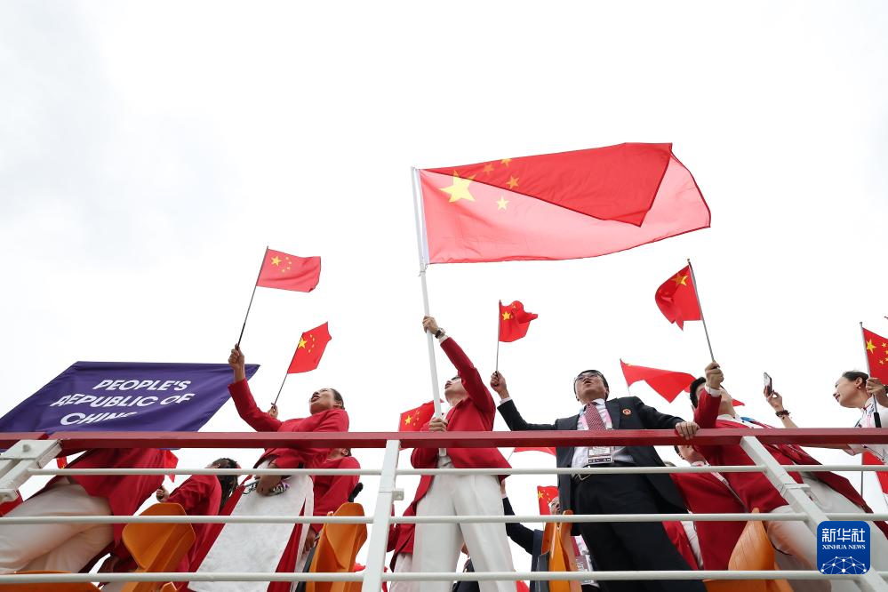7月26日,中國體育代表團成員在開幕式現(xiàn)場。新華社記者 王毓國 攝