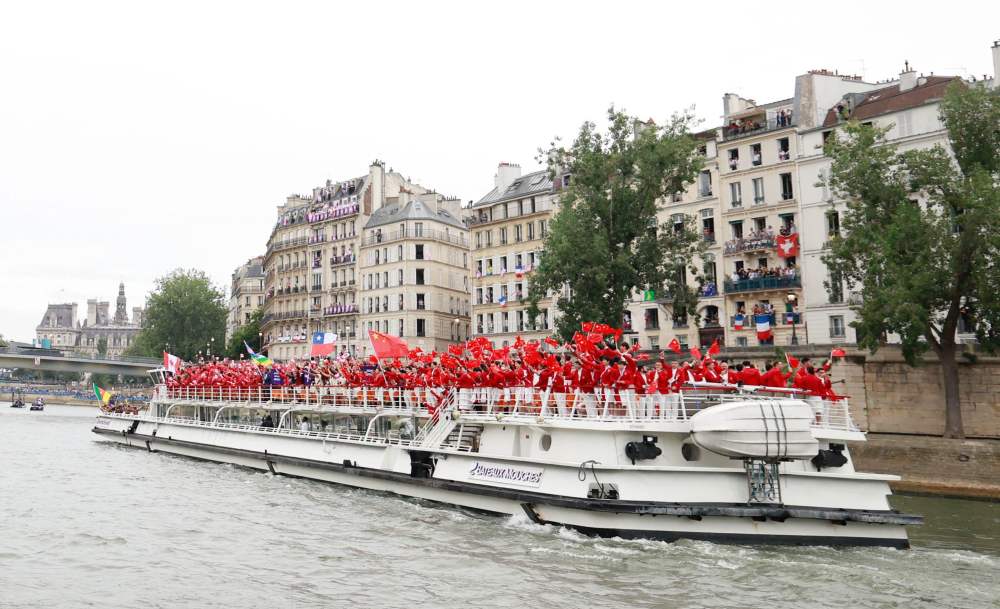當(dāng)?shù)貢r間7月26日,第33屆夏季奧林匹克運動會開幕式在法國巴黎舉行。乒乓球運動員馬龍、花樣游泳運動員馮雨高擎五星紅旗,中國體育代表團運動員乘船在塞納河巡游。