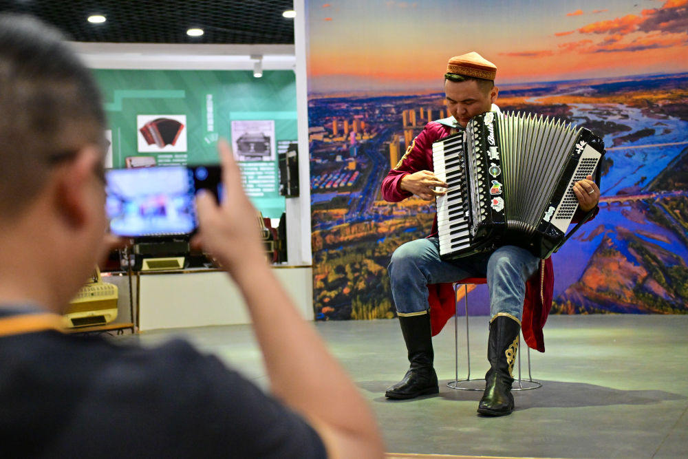 在伊犁哈薩克自治州伊寧市六星街,游客在亞歷山大手風(fēng)琴珍藏館欣賞手風(fēng)琴表演(7月27日攝)。