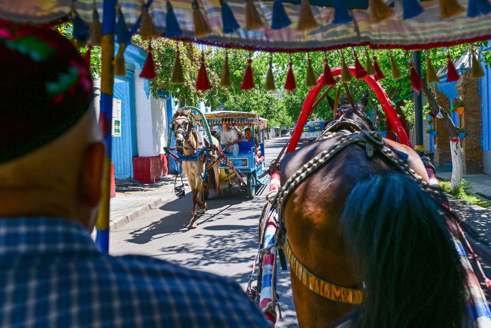 在伊犁哈薩克自治州伊寧市喀贊其民俗旅游區(qū),游客在錫伯車(chē)馬店觀光游覽(7月27日攝)。