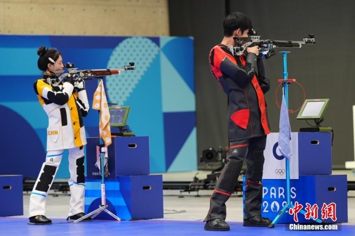 當?shù)貢r間7月27日,在法國沙托魯舉行的巴黎奧運會射擊10米氣步槍混合團體決賽中,中國組合黃雨婷/盛李豪奪得金牌。圖為黃雨婷(左)/盛李豪在比賽中。中新社記者 趙文宇 攝