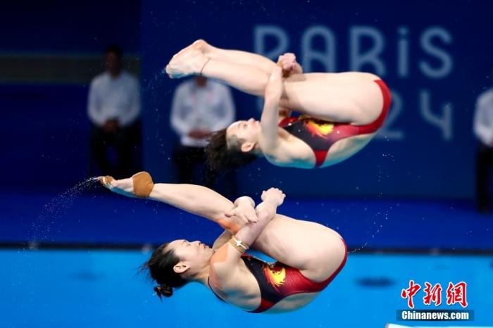 當?shù)貢r間7月27日,中國組合昌雅妮(下)/陳藝文在比賽中。當日,在巴黎奧運會跳水女子雙人3米板決賽中,中國組合昌雅妮/陳藝文奪得金牌。 中新社記者 富田 攝