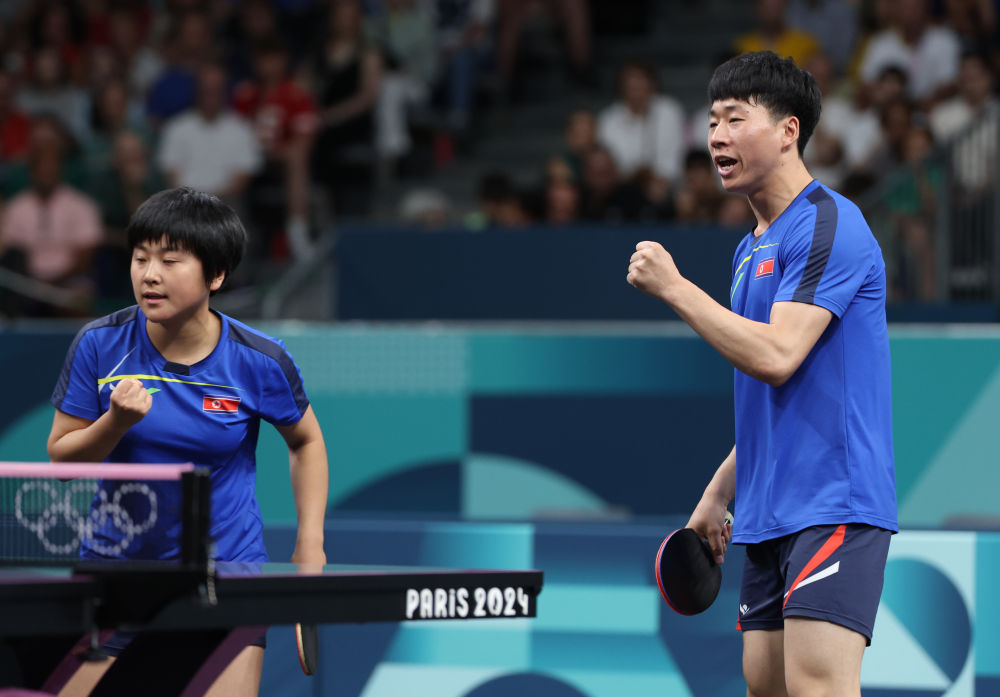 ↑7月30日,朝鮮組合李正植(左)/金琴英在比賽中。新華社記者郭昱攝