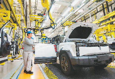 今年上半年,安徽省蕪湖市出口電動(dòng)載人汽車數(shù)量1.49萬輛,同比增長(zhǎng)144.3%。圖為在蕪湖市奇瑞新能源愛咖生態(tài)科技有限公司新能源汽車生產(chǎn)車間,工人在進(jìn)行組裝生產(chǎn)作業(yè)。