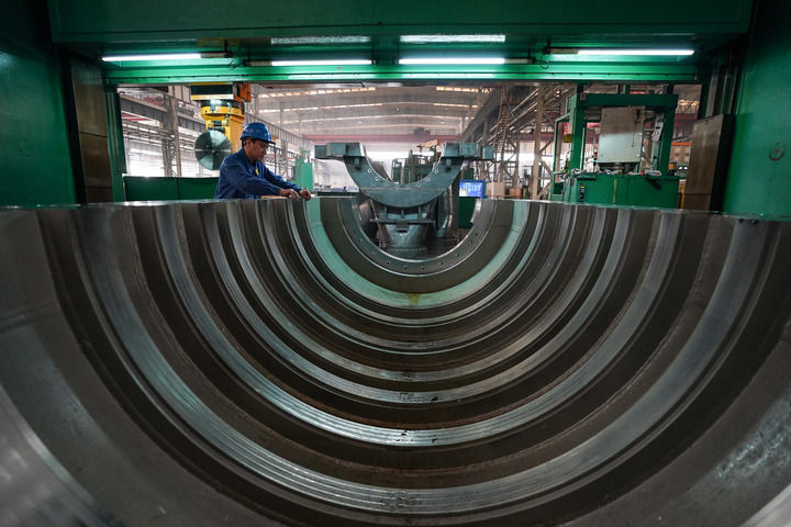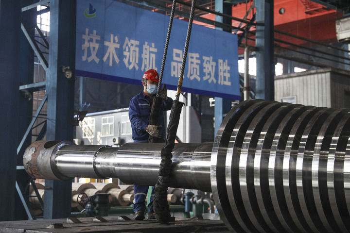 工人在位于黑龍江省齊齊哈爾市的中國一重集團(tuán)有限公司生產(chǎn)車間運(yùn)送產(chǎn)品(2024年3月5日攝)。