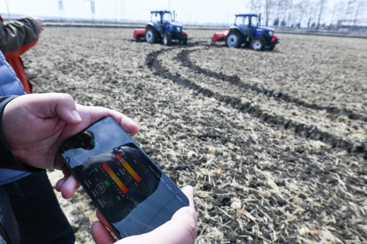 在黑龍江北大荒農(nóng)業(yè)股份有限公司友誼分公司智慧農(nóng)場的地塊內(nèi),技術(shù)人員操作兩輛拖拉機(jī)進(jìn)行無人駕駛測試(2024年4月3日攝)。